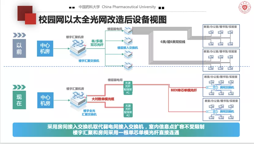 这也让学校收获了一个非常实际的效果——节省弱电间。中国药科大学在进行全光网改造之后,弱电间数量大幅减少,教学区原来需要维护多达30个弱电间,现在只维护1个,所使用的空间和运维人员的工作量都大幅减少。