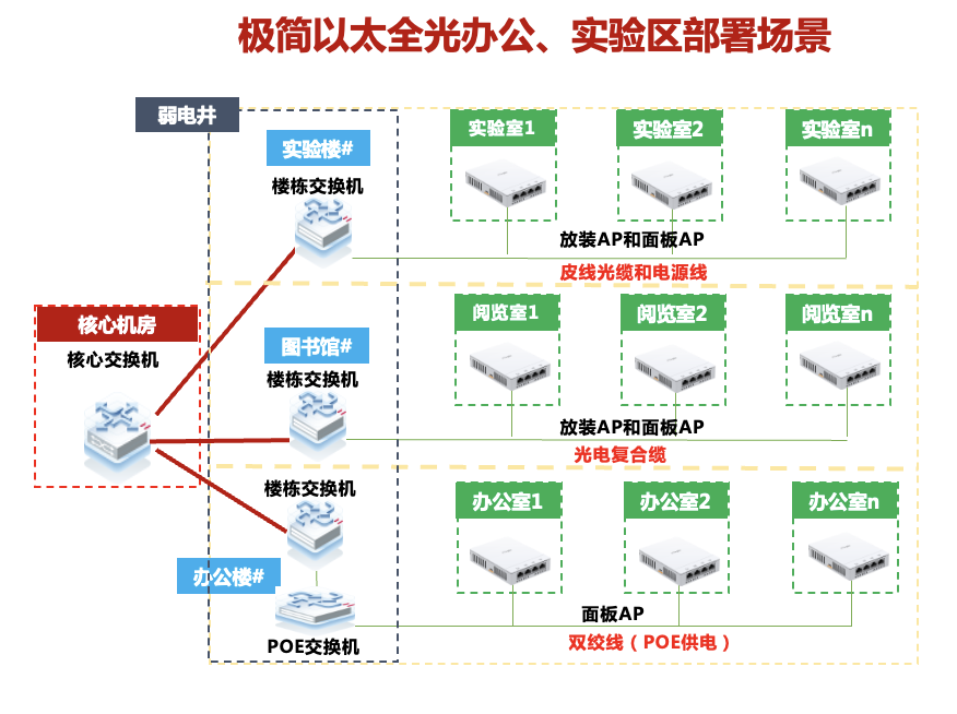 由于校园内部无线流量的不断增加,学校十分看重校园无线网的体验,因此想要将无线全网升级到最新的Wi-Fi 6。而想要发挥Wi-Fi 6技术的全部实力,传统以太网和使用分光的POL网络带宽不足以支撑。