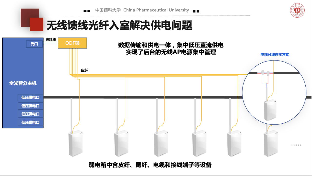 有一种办法能够避免“两害相权取其轻”的尴尬境地,就是数据传输和供电一体,集中低压直流供电。学校对于供电方式的考虑,让信息化建设管理处更偏向于使用集中供电的极简以太光方案,其包含了智分+主机和微AP,智分+主机采用皮线光纤连接入室微AP进行数据回传通信,同时单独提供电源为入室微AP进行集中远程供电,1路供电模块利用4平方线缆,通过总线串接的方式,可在200米范围内,带12路光AP,大幅节约了桥架空间和投资成本。这种方式避免了光AP本地取电的不便和混合供电的不安全因素,保障用电安全的同时,还可实现光AP的用电管理。