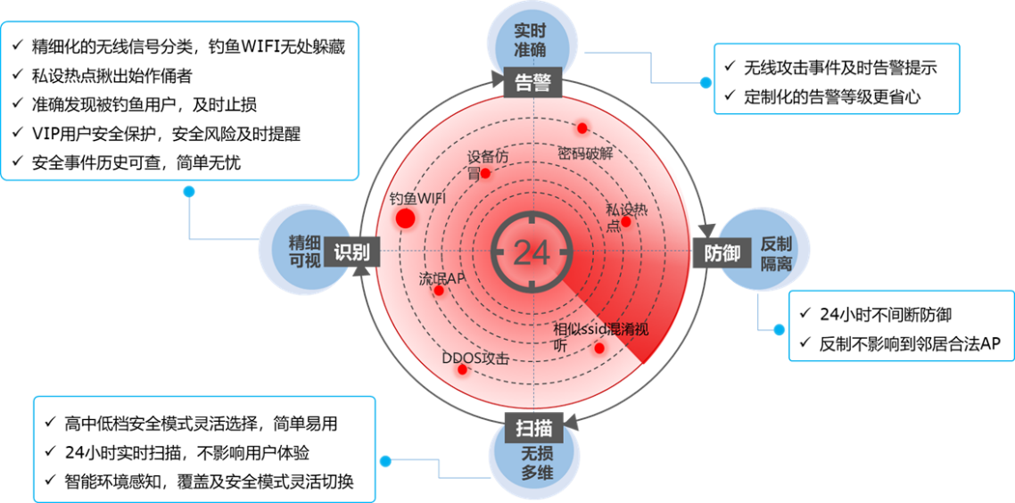 非法AP危害巨大,但要准确防控有一定难度:第一,相似度高难以辨别,非法AP为了避免被发现,利用类似字符,设置的SSID和合法的SSID非常相似,例如“0”和“o”,“l”等,难以发现;第二,资源占用过高,影响正常通讯。要保证及时监控,必须实时扫描,而这会占用现有的无线空口资源,使得正常的无线网络使用受到限制;第三,双频防护更复杂,目前日常使用的无线射频有2.4G和5G两个频段,要彻底防止非法AP,必须两个频段同时进行防护;第四,发现与处置需连贯,防止损失扩大,对于非法AP不仅要及时发现,还要及时对其进行反制和定位,切断感染源,阻止损失继续扩大。