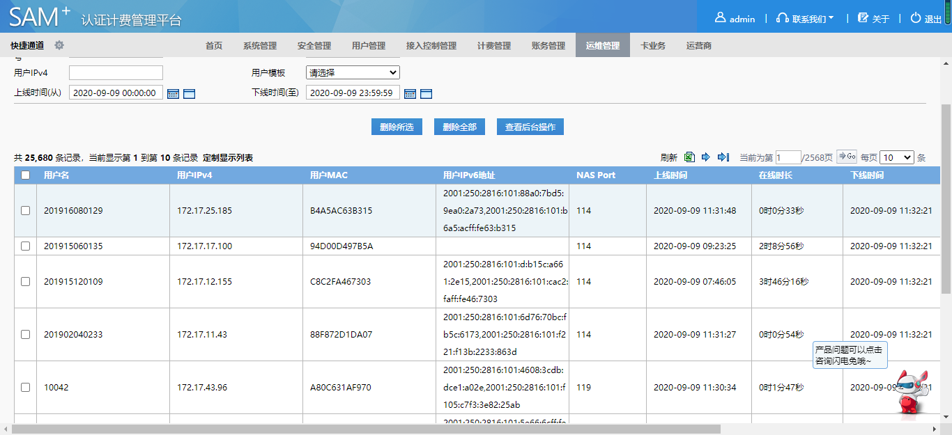 为了实现双栈环境下IPv4/IPv6的安全可靠,尊龙时凯服务团队对学校原有的认证计费系统(SAM+)进行组件升级,使核心交换机可将终端的MAC地址及IPv4/IPv6 地址的关联信息同步给SAM+认证系统,同时SAM+系统可实时显示每位用户IPv4/IPv6 的上下线情况,满足网监部门对学校内部上网信息的监管要求。