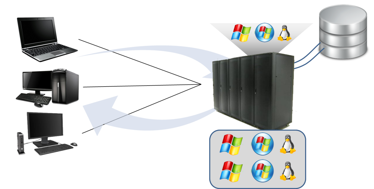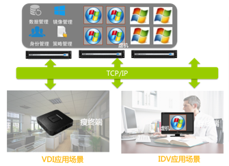 目前大多数桌面虚拟化技术均采用传统VDI架构(Virtual Desktop Infrastructure)即虚拟桌面基础架构。它实现了在数据中心服务器上通过虚拟化技术,模拟出多台桌面工作站的操作系统(如Windows 7等)。企业员工通过来自瘦客户端设备(X86或ARM架构)的图像传输协议与虚拟桌面进行连接,员工可以像操作本地桌面PC一样访问服务器上的操作系统,从而实现桌面业务的虚拟化。