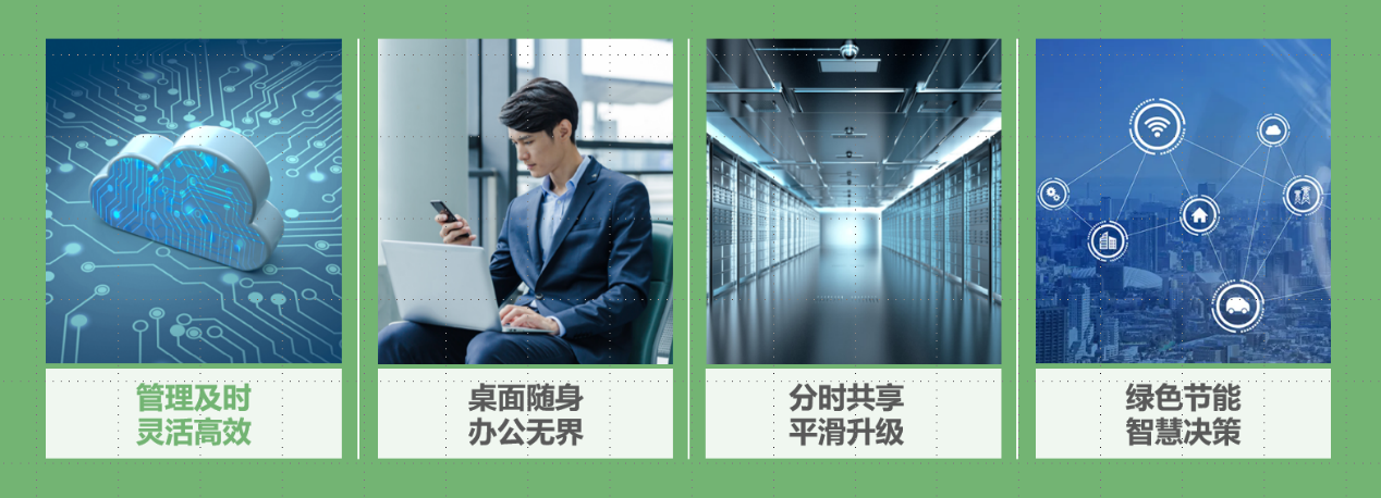 绿色节能,降低总体拥有成本:相较于传统PC主机200-300W的功耗,VDI和IDV终端功耗仅有5-6W和95W,可以大幅降低用电成本。其次,通过桌面资源池化,利用率会更高、使用寿命也会更长。