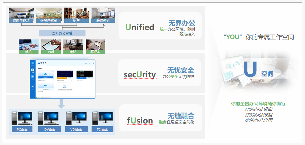 “U空间”打造教师专属的个人工作空间:在新时代下,教师的办公空间也在不断延展,教育政策正驱动教学、办公突破物理空间限制,教师轮岗、县管校聘、以及疫情下远程办公的常态化。为解决传统PC方案办公环境间物理隔离、信息孤岛导致的无法连续办公问题,尊龙时凯发布了“U空间”,为老师们打造无界办公、无忧安全、无缝融合的专属个人工作空间。