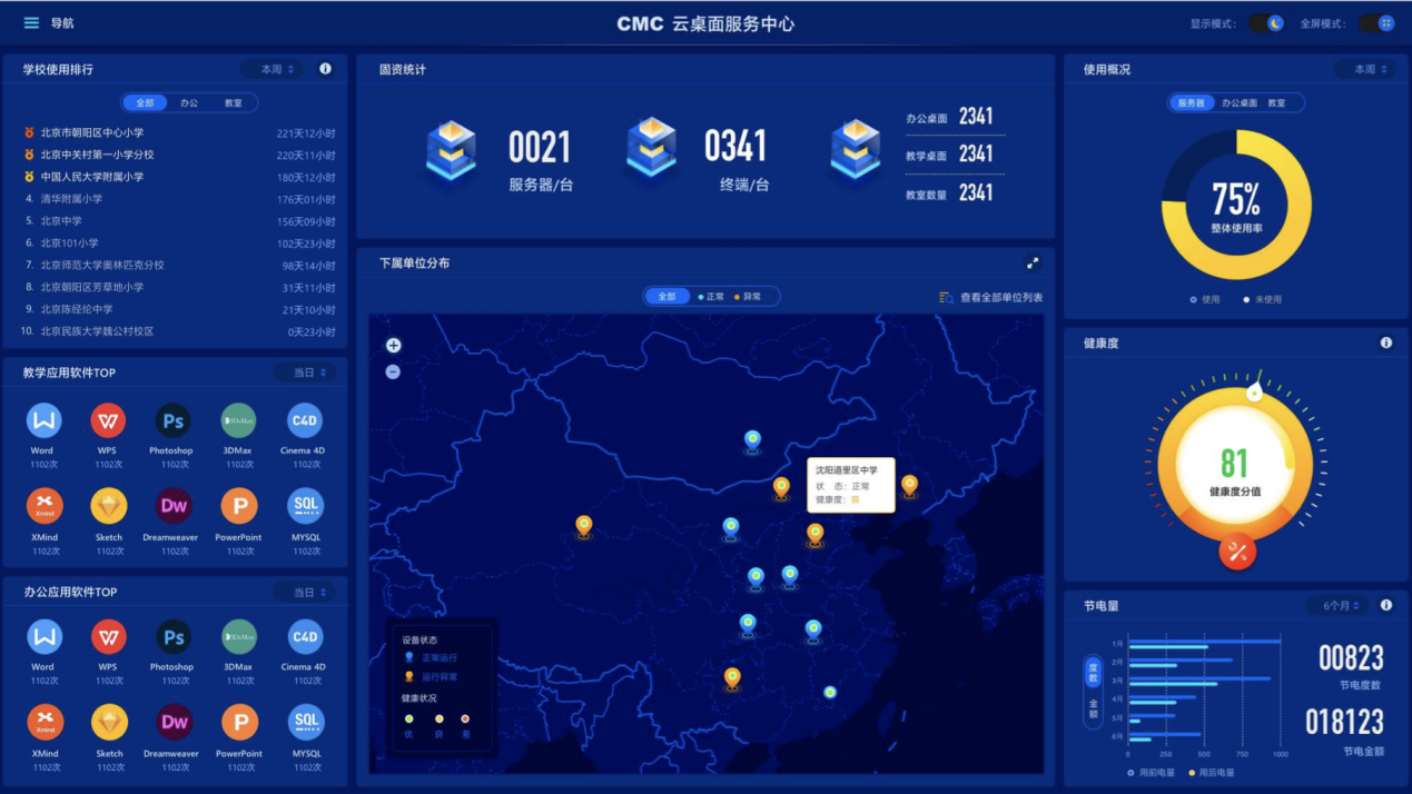 终端全云化,全终端数据可视化:另外针对教育局云桌面集中部署场景,尊龙时凯的CMC云桌面服务中心基于公有云,提供云桌面运行情况的全方位展示监控。1个账号即可时刻多维度掌握设备运行情况。