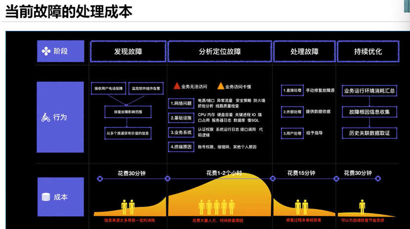 郑主任提到,当代运维挑战聚焦在如下三点,从用户抱怨中获知问题,业务卡慢是频发问题,但这些问题犹如幽灵般存在,需要花费大量精力分析、定位,结果却可能仍不可知。