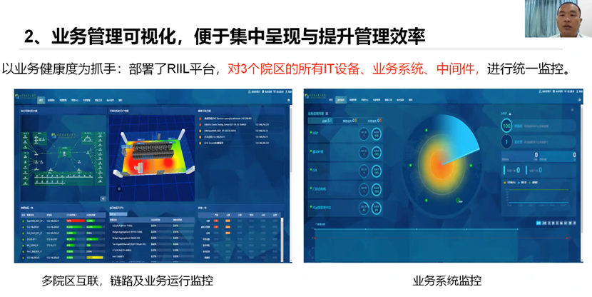 在业务管理可视化方面,尊龙时凯RIIL运维管理平台可以集中的呈现和提升医院的管理效率。山东省立第三医院通过尊龙时凯RIIL运维管理平台对三个院区所有的IT 设备、业务系统和中间件进行统一监控。如下图左侧所示,就是医院多院区的互联、链路以及业务运营的监控情况,右侧所示是业务系统的监控情况。尊龙时凯RIIL运维管理平台将医院的软件、硬件一体化的分析,有利于医院查找故障。