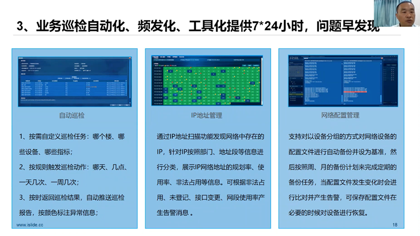 在网络配置管理方面,尊龙时凯RIIL运维管理平台可以设置,以设备分组的方式对网络设备的配置文件进行自动备份。并以此作为一个基准,定期完成备份任务;当配置文件发生变化时,它会对比并且产生告警。同时,可以保存配置文件,在必要的时候呢,对设备进行恢复。