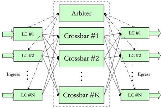 基于CIOQ的Crossbar同时满足了较大容量交换和较好的业务调度的需求,是一种比较完善的交换架构,交换容量可以从几百G到几T,通常支持10G接口但无法支持40G和100G接口。由于交换容量不是很大,交换网通常集成在主控板上,采用1+1主备或负荷分担工作方式。