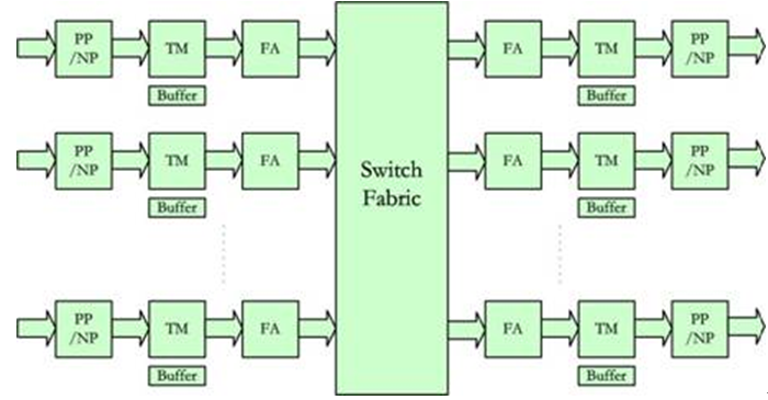 交换架构的一般模型如图1所示,在逻辑上由数据通道资源、控制通道资源这两个相辅相成的部分构成。数据通道资源具体包括交换网及其端口带宽、交换网适配器(FA:Fabric Adaptor)、流量管理器(TM:Traffic Manager)、缓存(Buffering)以及用于互联的高速总线。控制通道资源则包括用于资源分配、业务调度、拥塞管理的流控单元、调度器(Scheduler),调度器有时也叫仲裁器(Arbiter)。完整意义上的交换架构还包括报文处理器(PP:Packet Processor)或网络处理器(NP:Network Processor)。