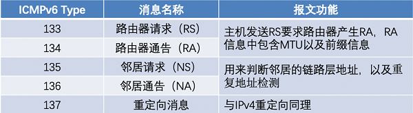 ICMPv6消息类型中有5种是为了支持邻居发现协议而定义的,功能如图2描述: