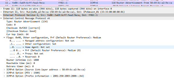 每台路由器以组播方式定时发送RA报文,用于在二层网络中通告自己的存在。RA报文中会带有网络前缀信息,及另外的一些标志位信息。RA报文的Type字段值为134。