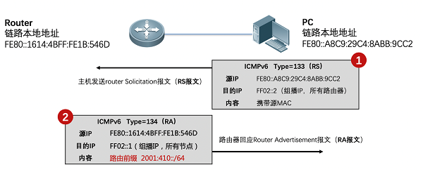 相比于前者,无状态地址自动配置则显得更加便捷,IPv6终端使用无状态自动配置能够做到即插即用,无需部署额外的应用服务器、无需使用DHCPv6。在IPv6路由器与IPv6主机之间,利用ICMPv6协议中的路由器请求消息RS(Router Solicitation)和路由器通告RA(Router Advertisement)消息来完成无状态自动配置过程。主机通过RS消息发现链路上的IPv6路由器,而IPv6路由器通过RA消息向主机通告IPv6地址前缀信息,主机在收到IPv6前缀信息后,与自己的网卡接口ID一起构成128位的IPv6全局单播地址。