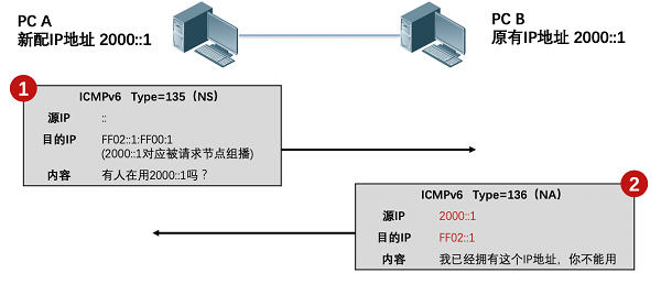 • 如果PC B发现2000::1是自身的一个试验地址,则PC B放弃使用这个地址作为接口地址,并且不会发送NA报文。