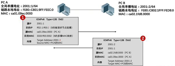 1、PC A在向PC B发送报文之前它要先解析出PC B的MAC地址,所以首先PC A会发送一个NS报文,其中源IP地址为PC A的IPv6地址,目的IP地址为PC B的被请求节点组播地址(前缀FF02::1:F/104,并结合请求IPv6地址中的低24位,具体细节请参阅上一期),需要解析的目标IP为PC B的IPv6地址,这就表示PC A想要知道PC B的MAC地址。同时,NS报文还携带了PC A的MAC地址。