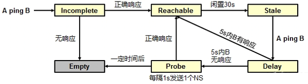 • 探测(Probe):邻居可达性未知,正在发送邻居请求探针以确认可达性.